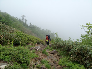 雨とはいえ、登るので雨具の中で汗をかき、外からは雨…